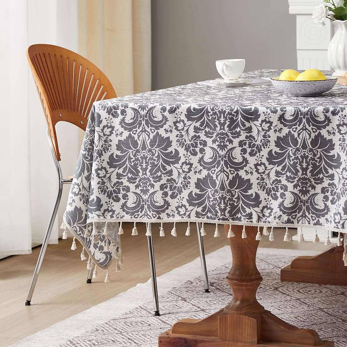 Boho Tablecloth Euro Floral Cotton Linen Gray Printed Tablecloth with White Tassel Lace, Wrinkle Resistant Shrinkage Resistant, Suitable for All Styles Dining Room Kitchen (55 X 55 Inch) Gray