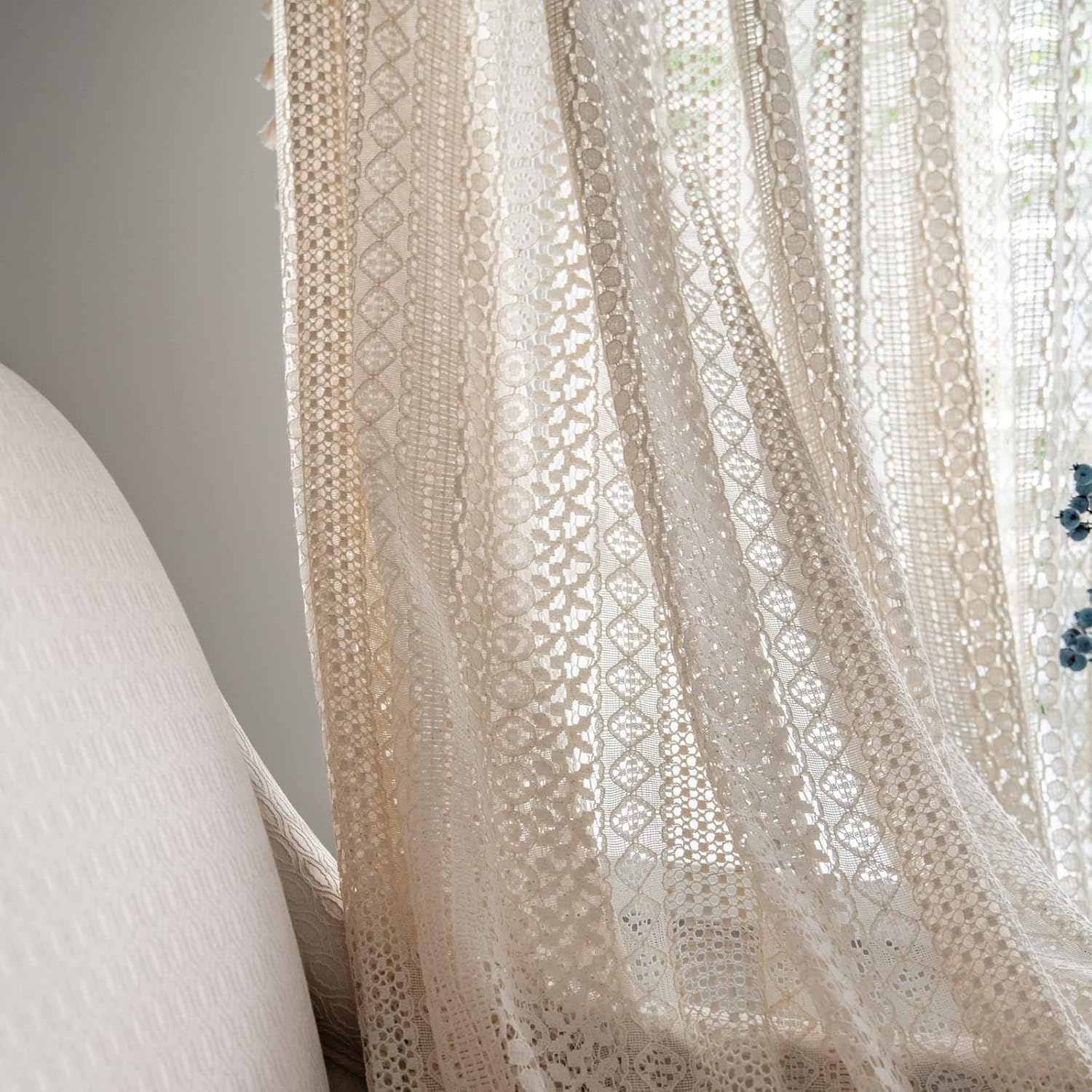 Curtains Crochet Lace Semi-Sheer Bohemian Hollow Knitted Handmade Tassels, Rod Pocket Window Treatment Vintage Rustic Farmhouse Drapes for Living Bedroom, 1 Panel 59″ W x 84″ L, Beige