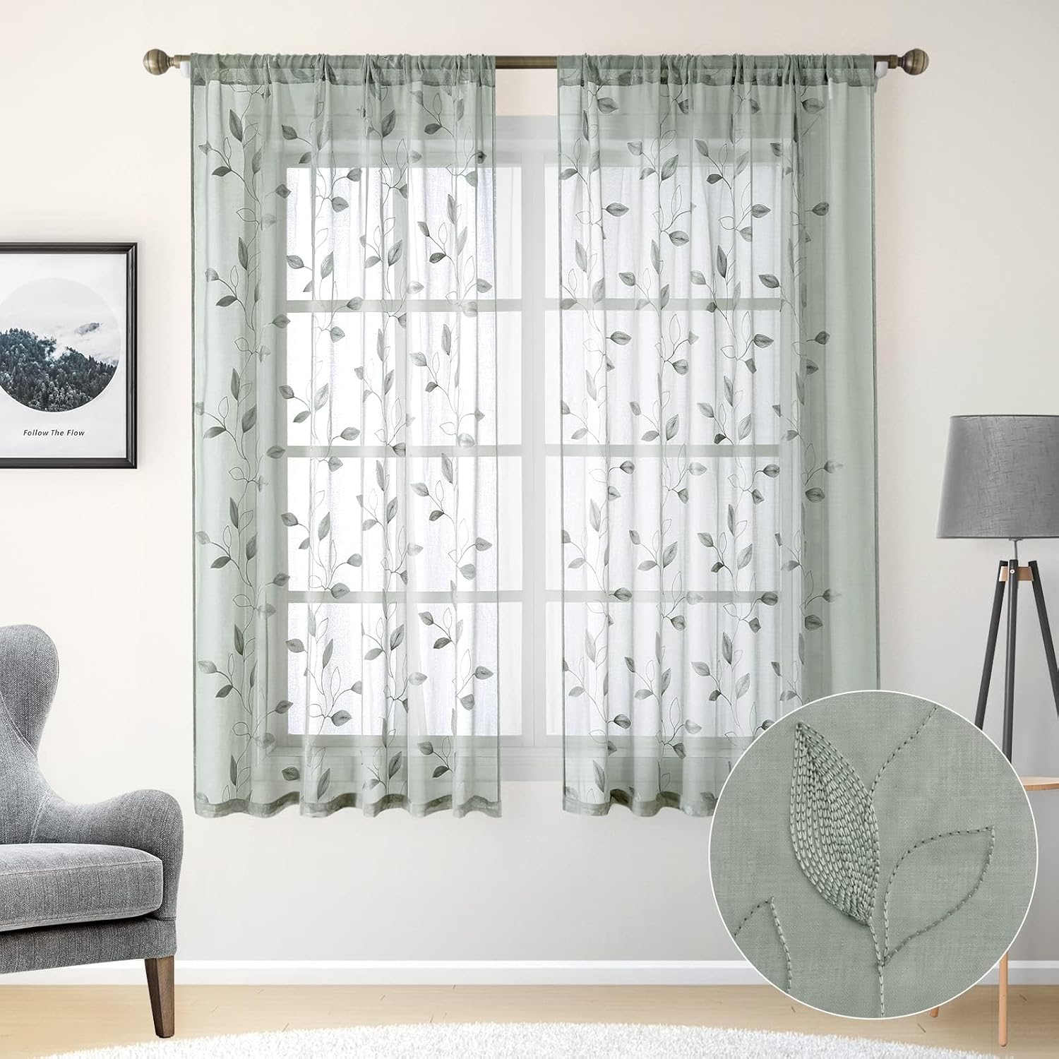 Sage Green Sheer Curtains 52 X 63 Inches Length 2 Panels Embroidered Leaf Pattern Pocket Faux Linen Floral Semi Sheer Voile Window Curtains/Drapes for Bedroom Living Room