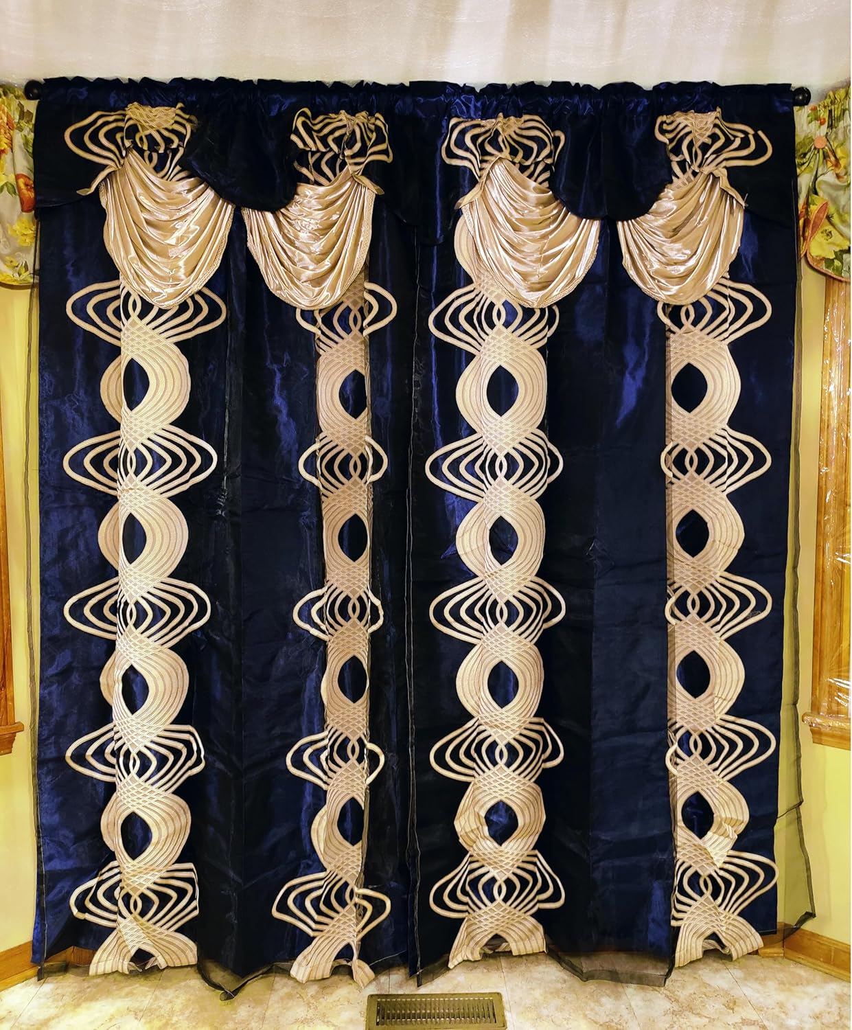 - Taffeta backing is of DEEP color, while the pattern and valance is of GOLD color. Such combination helps to achieve an ELEGANT CONTRAST COLOR effect. This curtain can attract attention of any visitor to your house and can win great praise for you.