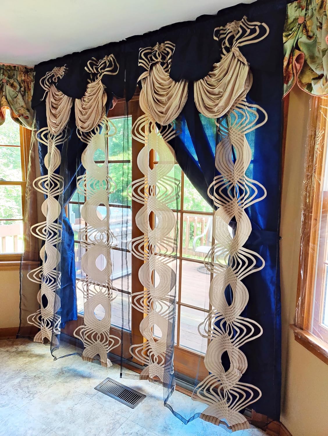 - This curtain is of double layer. Front layer is / voile jacquard with BIG VERTICAL spinning lines ( To me, it looks like melody lines ) design. Backing is taffeta fabric in deep color. One curtain rod is enough to have this nice curtain with both valance & backing. It also gives flexible way for you to either tie the front curtain or the backing or together to achieve different decoration effect and meet different needs for the light.