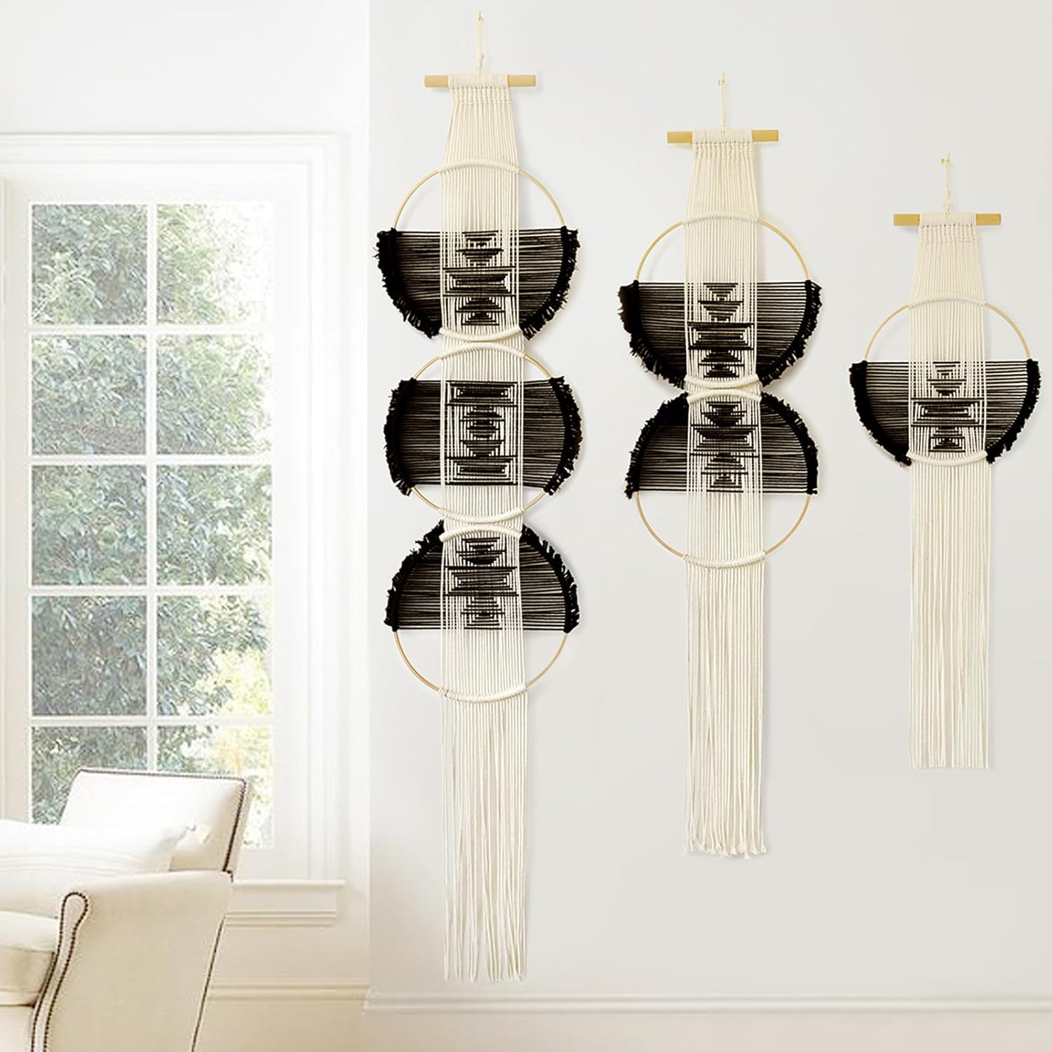 Wall Hanging Combination 3 Pcs Beige and Black Handmade Woven Boho Home Chic Wall Decor Geometric Art Decor Bedroom Nursery Apartment Dorm Decoration Minimalistic Neutral Wall Decor