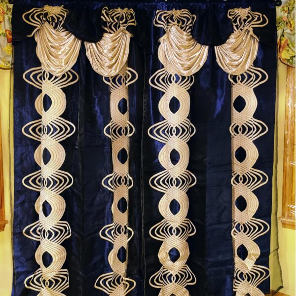Voile Jacquard Window Curtain with Attached Fancy Valance and Taffeta Backing. 2pcs Set. Each pc 54 inch Wide x 90 inch Drop + 18 inch Valance. (Navy Blue)